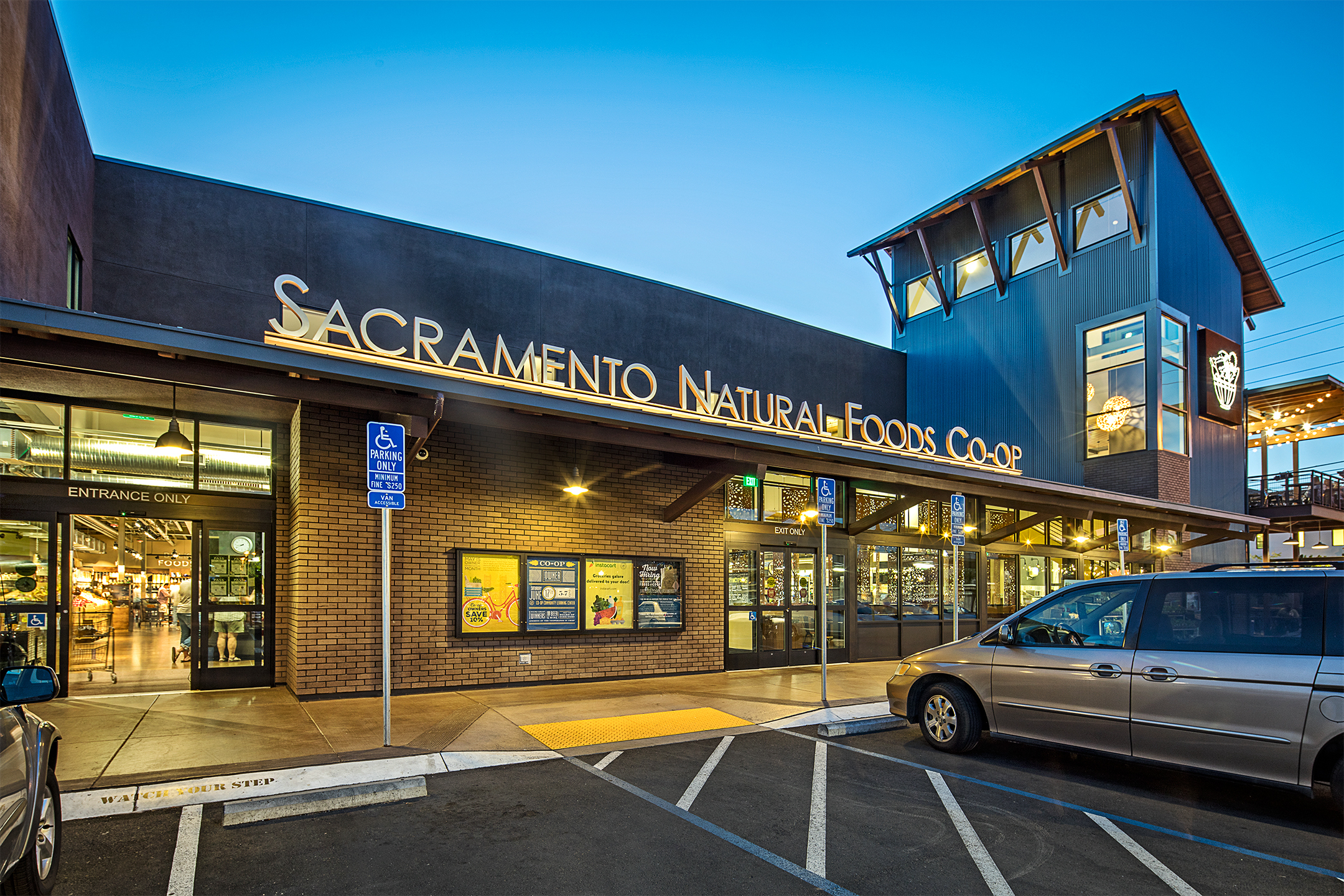 The Sacramento Natural Foods Co-op, established in 1973, reopened in a vibrant new structure a few blocks from its original store. Home to an expanded market, café and delicatessen, administrative offices, meeting rooms and classrooms with a full commercial demonstration kitchen, the complicated infill site was once a junkyard. The adjacent tilt-up concrete parking structure includes electric vehicle charging stations and a large enclosed bicycle storage and maintenance room for staff. The store and parking structure were required to seamlessly blend structurally and aesthetically with the surrounding stores and public right of way. This was accomplished through the use of green screens for vegetation growth to blend in with existing established trees that were preserved during construction. The resulting project has been well received by members of the community at-large and has taken its place as a vital new Sacramento civic amenity.